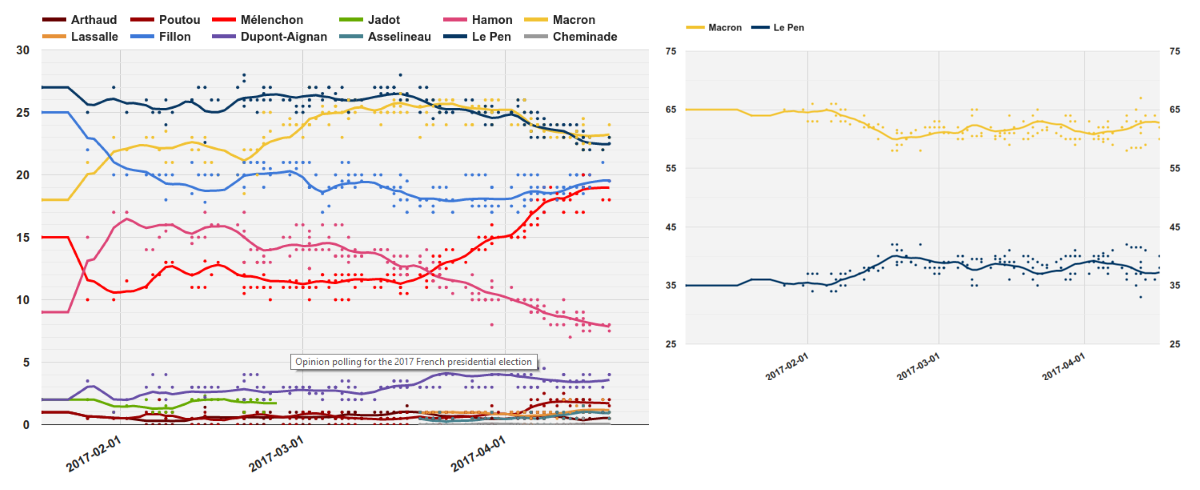 Isso é partir do princípio de que é Macron a passar à segunda volta. O que sendo neste momento provável, não é de todo seguro dados os ~5 pontos de diferença para Fillon. Há um mês o cenário era praticamente o oposto.