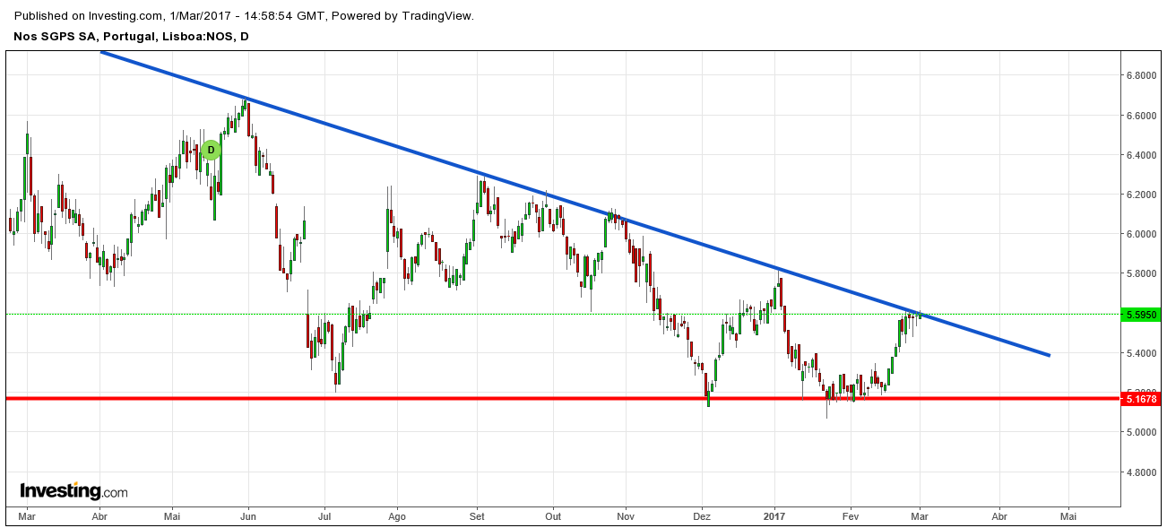 A análise técnica tem aspectos muito interessantes: que grande luta está a ocorrer no gráfico da NOS!
