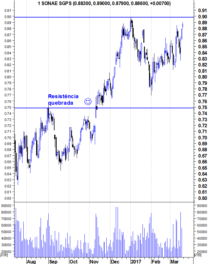 Deixo os gráficos actualizados da Sonae que já leva 8 meses de subida e que tem confirmado todos os bons sinais que deu quando quebrou a resistência dos 0,75 euros. Está próxima do seu grande desafio que é a zona da resistência entre os 0,9 e os 0,95 euros. Quando conseguir romper consistentemente esta zona, terá ultrapassado o último bastião dos ursos e os touros dominarão todos os horizontes temporais. Falta um último passo.