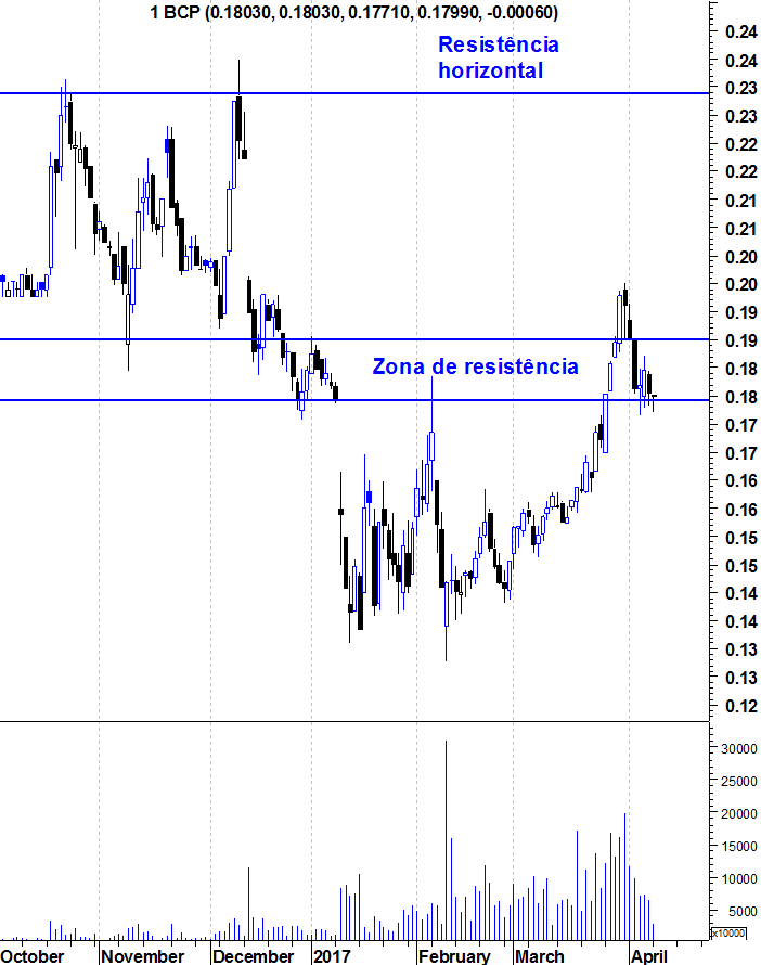 O gráfico diz que o BCP tem ainda que quebrar consistentemente a sua primeira grande resistência entre os 0,18 e 0,19. Por isso, é preciso algum cuidado quando se diz que os gráficos apontam para uma subida. O PSI já quebrou consistentemente a sua resistência, o BCP ainda não.