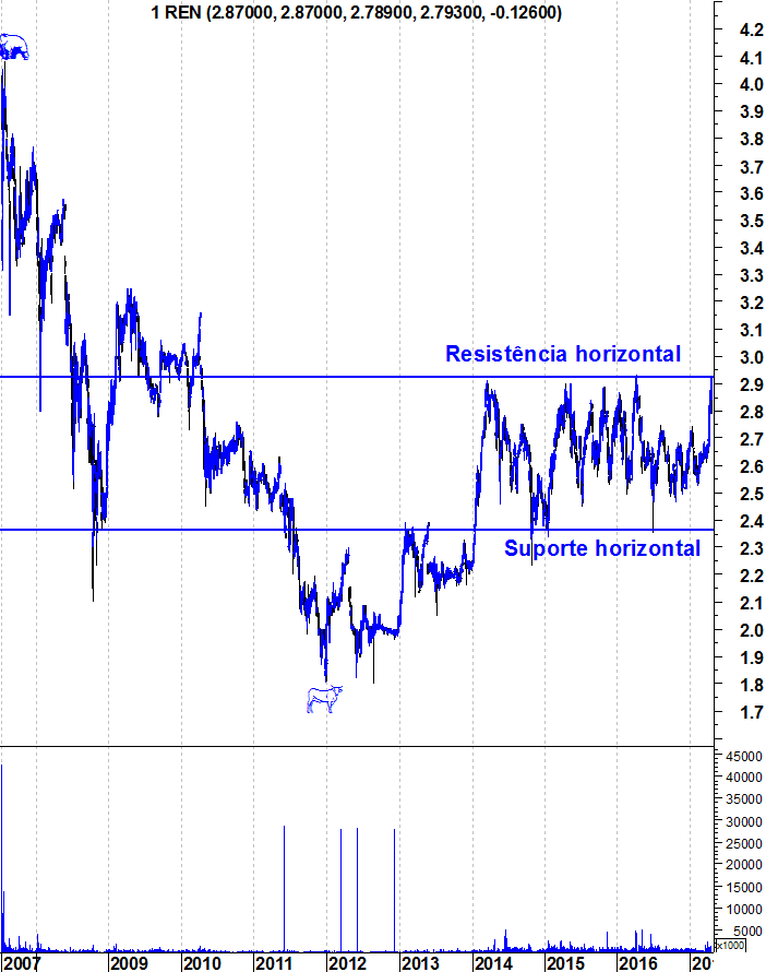 Uma acção que lateraliza há mais de 3 anos é aborrecida? Sem dúvida. Mas, como sempre digo, aquilo que de mais interessante têm as lateralizações são o seu final. Quando a REN conseguir quebrar consistentemente este monótono intervalo terá caminho aberto para definir o seu rumo. Se a quebra for ascendente, o alvo será a zona dos 3,45 euros. Se for descendente, o seu alvo será a zona dos 1,8 euros.