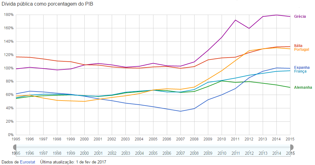 Segundo o Eurostat, Portugal tinha, no final do terceiro trimestre um rácio de dívida de 133,4% do Produto Interno Bruto (PIB), o segundo maior da Europa (o maior fardo é do grego, com 176,9%). Espanha tem uma dívida elevada também, mas é a sexta maior da União Europeia, com um rácio de 100,3%.