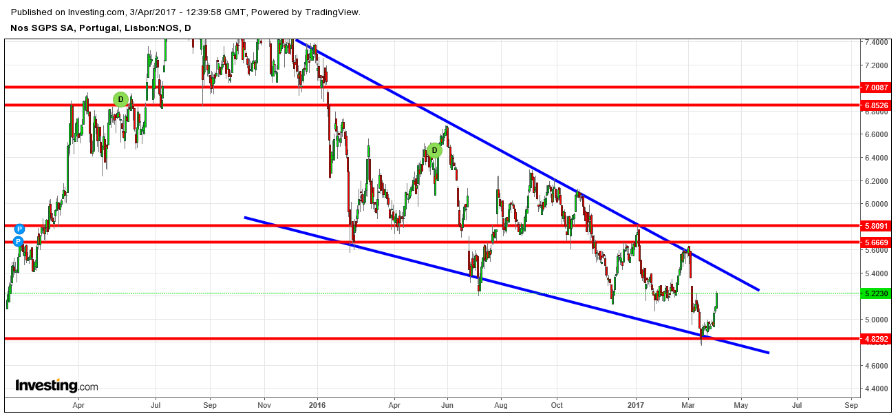 Se não contarmos com a LTD dos máximos relativos, que não tem dado tréguas. Diria que aos 5,40 deve abrandar. Na minha estratégia, que passa por me livrar da NOS, aos 5,40 entro com um trailing stop colocado a 5,30.