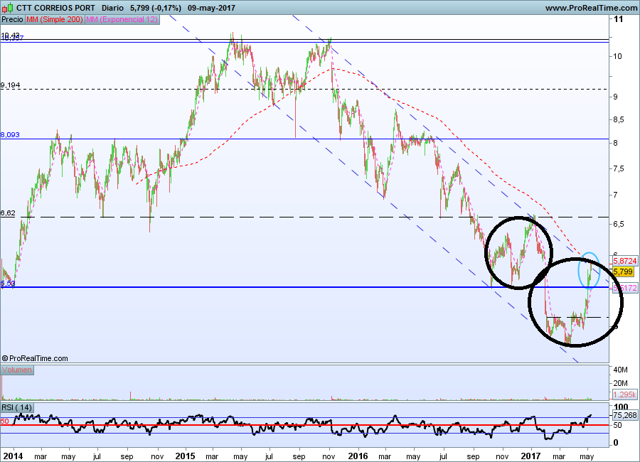 De facto, a price action CTT (Bull de médio prazo na superação dos 5.66€), está muito congestionada abaixo dos 5,9€, na confluência de 4 Resistências mais ou menos relevantes e "1 psicológica" - A Tentativa de passagem a Bull de Longo Prazo passa por: