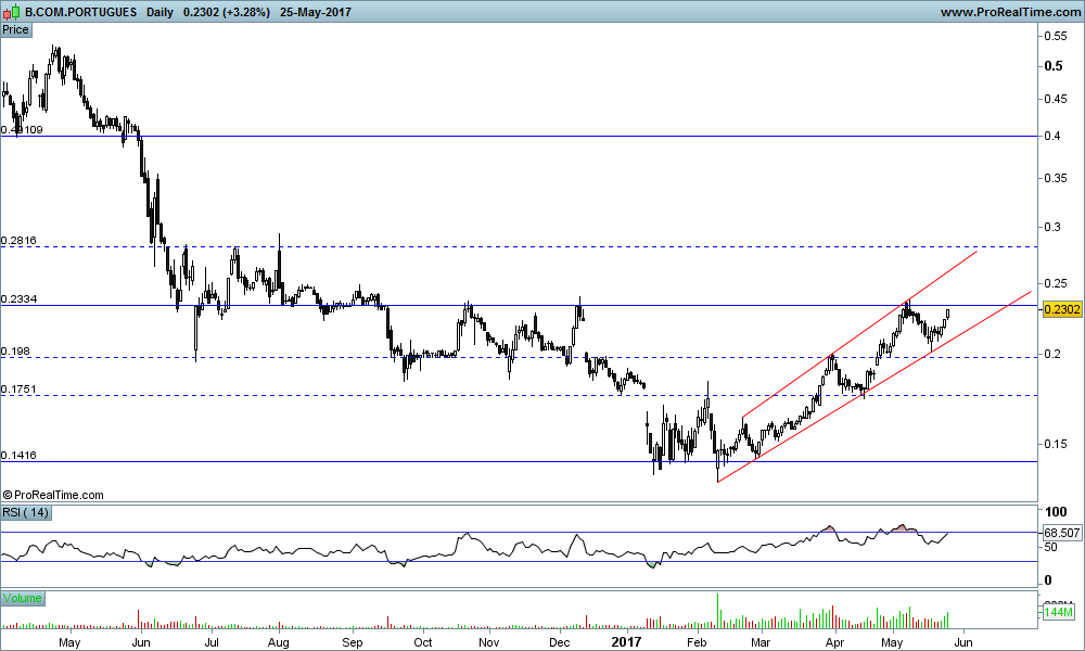 EAGLETRADER20 Escreveu:Este titulo para além da resistência obvia dos 0.23 atingida após tocar no suporte dos 0.20, poderá agora focar-se mais no acompanhamento do setor na Europa que aparenta estar a começar uma inversão, e se for para prosseguir este titulo deverá seguir os seus pares Europeus.