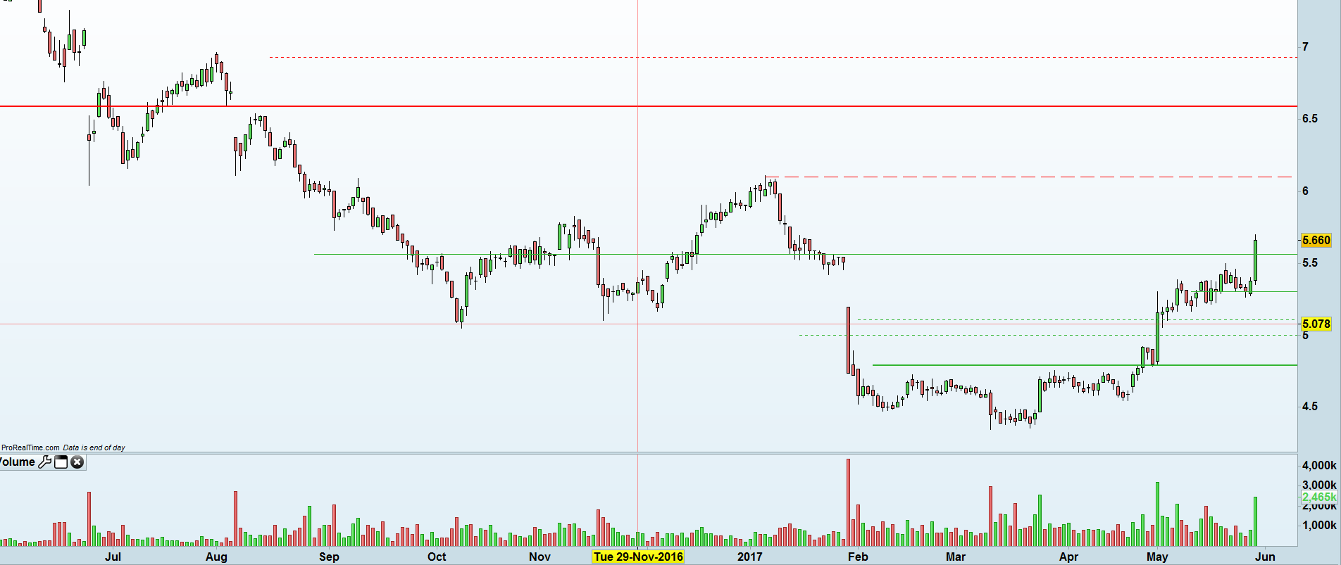 No ultimo dia do dividendo, dia 16/05, a cotação fechou a 5,707, tendo o mínimo nesse dia sido 5,7 coincidindo com o máximo de ontem, mas em ambos (tanto mínimo e máximo), não se aguentaram nos fechos, por isso não considero que os gaps tenham sido fechados com sucesso.