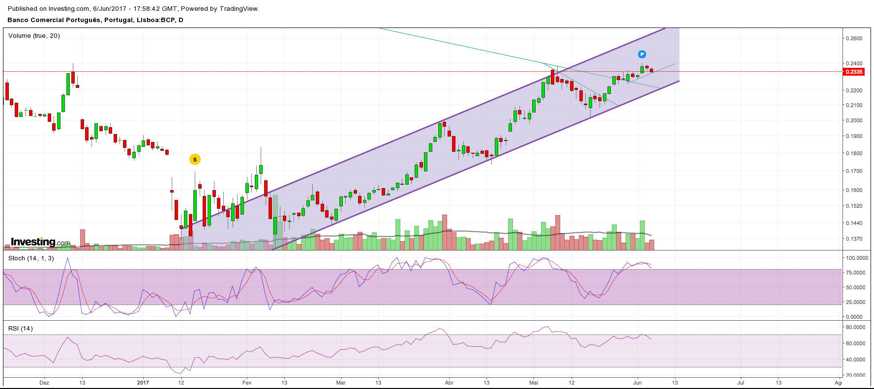 O BCP mantém-se no caminho e a tendência é clara. A menos que fure em baixa a linha ascendente de médio prazo, em Agosto deixará a casa dos vinte cêntimos.
