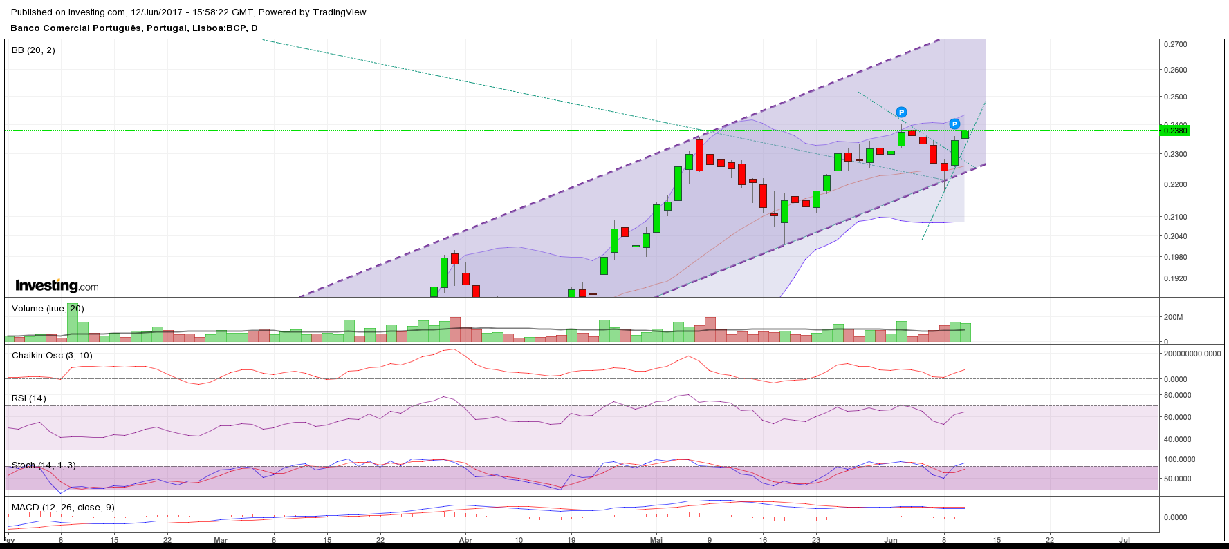 Não conseguiu ultrapassar os 0.24 o que não é positivo para já, e hoje está negativo provavelmente pela incapacidade de vencer a resistência imediata forte, e poderá ter um recuo neste ponto para consolidar antes de tentar novamente ultrapassar esta forte barreira .