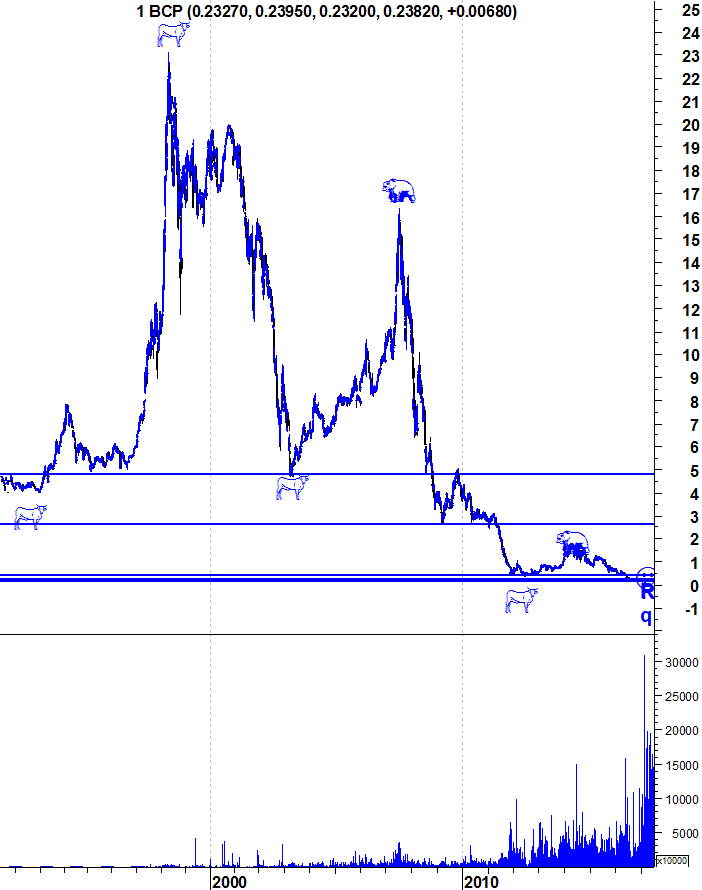 De facto essa linha está lá, mas creio que perde relevância face à grande resistência que são os 0,24 e que me parece ainda ser a grande barreira às subidas da cotação, e é só por isso que não a considero no meu gráfico. Quanto a figuras, não me parece estar a fazer nenhuma sinceramente. Nem sempre duas linhas formam uma figura, acho eu. Portanto em geral estou contigo, o volume nas subidas tem sido bastante forte e este respirar sem ir muito abaixo antes de partir a resistência dos 0,24 parece-me positivo. Estou optimista e o martelo de hoje foi mais um sinal de força, mesmo com notícias aparentemente adversas. Veremos.