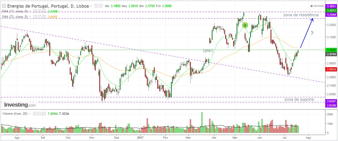 Todos os gaps têm que ser fechados. Esta cotada caiu durante muitas sessões consecutivas, fechou o GAP de abril, caiu um pouco mais e agora tem recuperado. Possivelmente as más noticias tidas sobre a EDP já foram descontadas, e a ausência de mais más noticias impulsiona o mercado para agora retomar novamente o seu ritmo até aos 3,2€.