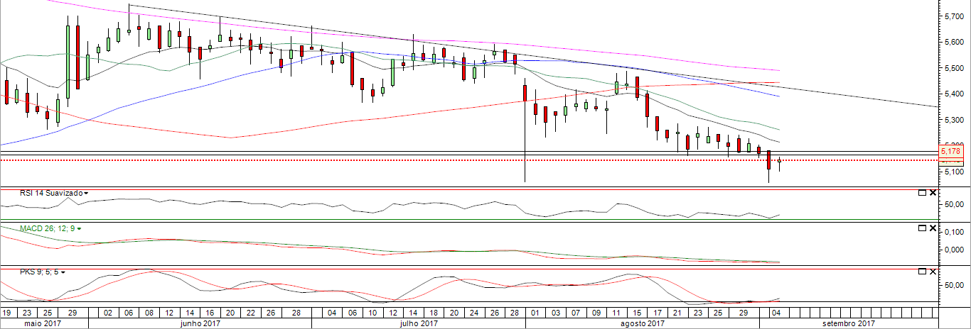 Apesar da subida de hoje foi possível verificar, em time frames menores, uma quebra acentuada da cotação no final da sessão.