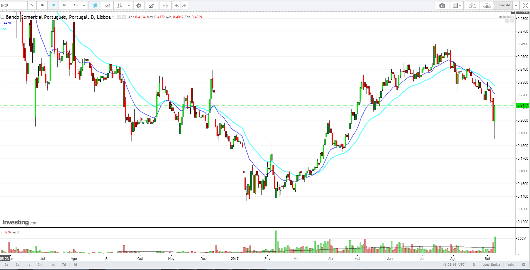 Ando muito afastado dos mercados, mas achei curiosa a negociação do bcp esta semana, em particular hoje. Alguém tem aí um gráfico já actualizado com a brutal vela de hoje?