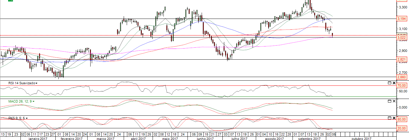 -RSI naturalmente a aliviar após as quedas desta semana. Existe margem para continuar a cair antes de uma potencial recuperação;