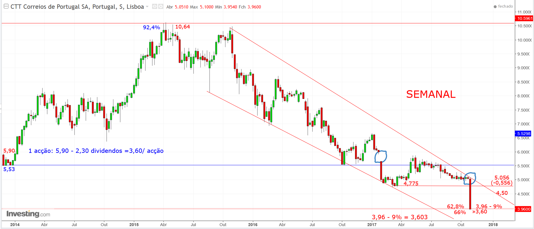 Será que estou enganado? Quanto a mim, o preço ajustado por agora, será por volta dos 3,60€. Mas quem quer ficar agarrado a uma coisa que está para continuar a cair?! A próxima e ainda pior notícia poderá ser novo corte nos dividendos.