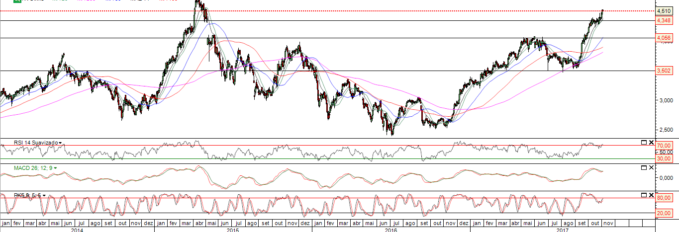 -O semanal por enquanto ainda se safa ( https://invst.ly/5ujs2 ), pois a linha MACD ainda não cruzou a linha sinal, a OBV ainda está perto de máximos, a TRIX ainda está com tendência positiva e a DMI apresenta ainda sinais positivos pois ainda não houve cruzamento entre a DI+ e DI-;