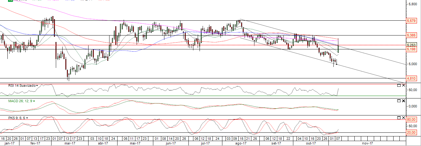 contudo vamos acompanhando se fecha em valores muito acima 5,26 que será o topo do canal descendente...