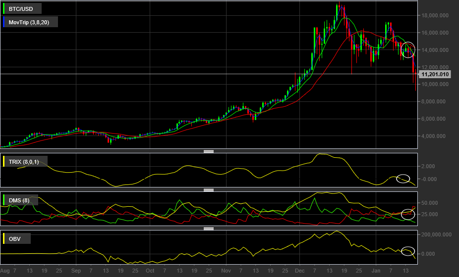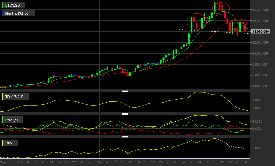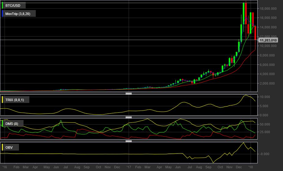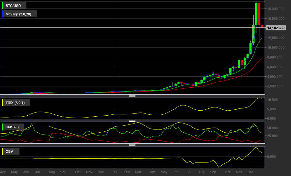 Ora viva, aqui continuo com a mesma opinião de algumas semanas, a volatina está alta, bom para tiros de curto prazo e baralha as contas de quem está num time frame maior. Continuo a afirmar na minha opinião que a bitcoin não está ainda em bear market apesar da violência das descidas. Enquanto a tendência de venda não entrar no semanal e o preço continuar a trabalhar acima da MM20 nada feito. Já no diário a venda entrou com a quebra dos 14k,com todos os indicadores a indicarem venda em simultâneo,(venda santa