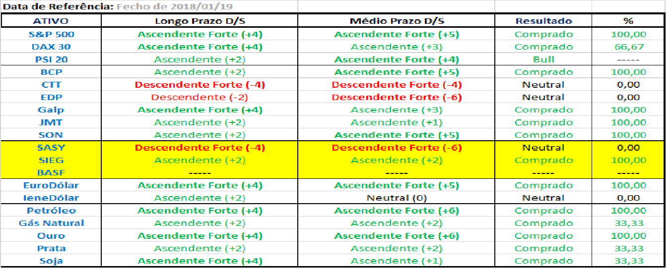 No seu conjunto o panorama no S&P apresenta um alerta ou um grande risco de passar brevemente a neutral, provavelmente por estar esticado em demasia numa zona de mini-tendência...neutral (zona definida por estar situada a seguir a uma linha vertical amarela). Basta olhar para o quadro de controlo e verificar que a força de rating atual do índice na zona dos sistemas entre médio e curto prazo é já nesta altura bastante fraca, apenas de +1 ponto, embora ainda se encontre positiva e portanto com uma resultante global de sinal longo.