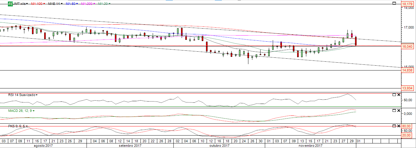 Se escolhesse um prazo mais curto ou mais longo, a JMT estaria num canal ascendente. Há que elogiar este jogo de cintura para encontrar precisamente o período temporal em que o título se encontra em tendência decrescente.