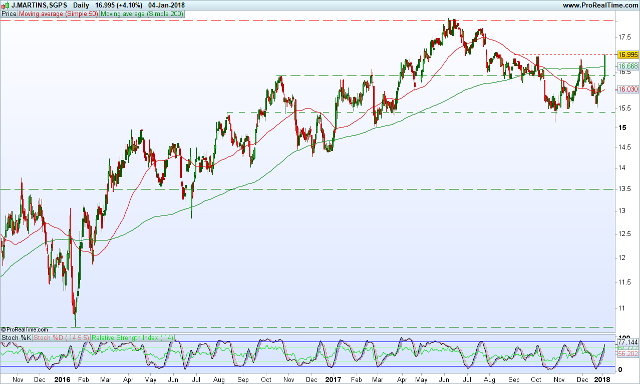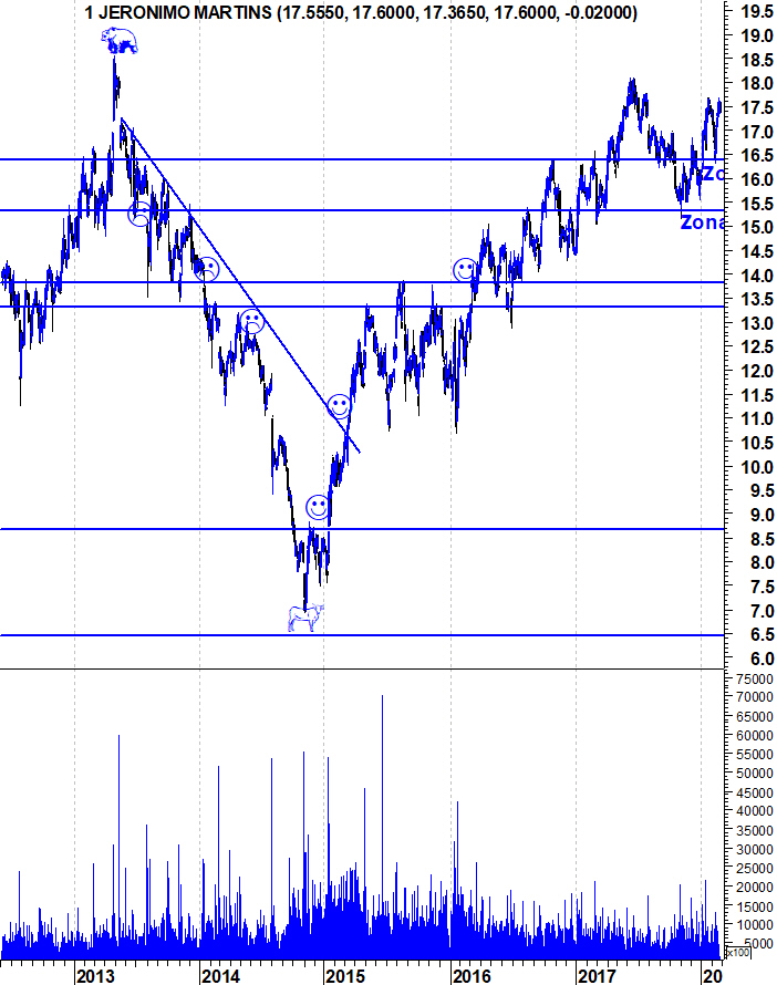 Desde os máximos do Verão passado a Jerónimo Martins apresentou quedas de mais de 15%, tendo inclusivamente quebrado o suporte importante nos 16,39€... A recuperação destas ultimas semanas e a recuperação deste suporte, fez a acção estar a apenas 6,5% dos máximos de 2017 e cerca de 9% dos máximos absolutos. Na zona de fecho de hoje, encontramos uma pequena resistência, que, ao ser superada, levará a JMT para junto da zona de resistência (18,10-18,30€). Desde os mínimos de 2014, a acção já valorizou cerca de 160%. A superação da resistência na zona dos 18,10€, fará a Jerónimo Martins "navegar por mares nunca dantes navegados", activando uma Cup and Handle com uma projecção bastante aliciante para navegarmos com ela ao longo dos próximos anos. Ficam os gráficos...