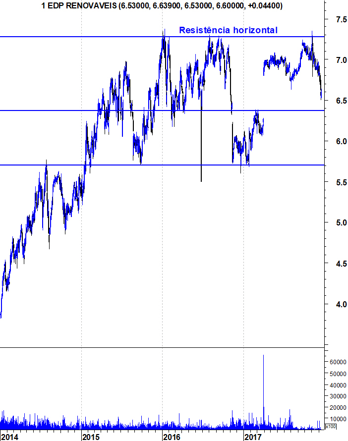 Desde aí, o título tem estado muito monótono, com reduzida volatilidade e, habitualmente, ligeiramente acima do preço da OPA, nos 6,80 euros. É normal que, durante algum tempo, as empresas alvos de OPA`s falhadas fiquem “amarradas” a esse valor de referência mas, passado algum tempo, acabam por ganhar vida própria. A acção encontra-se agora muito perto da importante resistência entre os 7,25 e os 7,3 euros. É este o valor a ser vigiado pois, caso seja quebrado consistentemente, abrem-se portas para a EDP Renováveis poder atacar o seu máximo histórico na casa dos 8 euros, no momento em que foi dispersa em Bolsa.