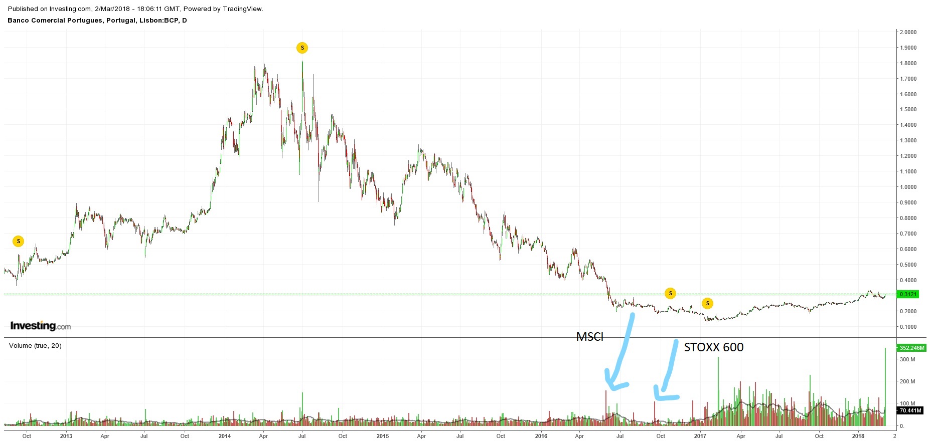 Nas ultimas saíadas destes índices o volume foi literalmente enorme (para a altura) na véspera. a do MSCI a 31 de Maio e a do Stoxx 600 a 16 de Setembro de 2016, na sessão seguinte já não negociaram. Mas na altura do anuncio, no caso do Stoxx 600 o anuncio foi a 23 de Agosto, nos dias logo a seguir não mexeu com volumes significativos. Apenas na ultima sessão antes da saída. o Grafico mostra isso.