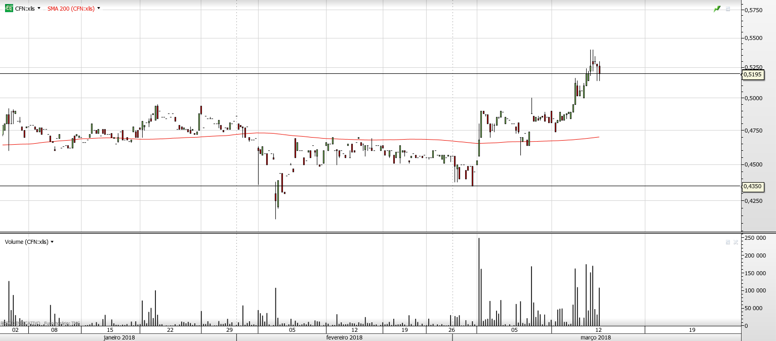 O quadruple witching já se faz notar nesta cotada. Os fundos já estão a refazer as suas carteiras e a COFINA é aposta para 2018, pelos volumes destes últimos dias. Tal como o Salvador Guru só penso vender a minha posição ao dobro da cotação atual, no mínimo. A equipa de gestão é fantástica (vejam o trabalho efetuado na Altri e F.Ramada, duas tenbaggers, será a COFINA a terceira?) e ainda que existem dificuldades no negócio tradicional, nunca deu prejuizo nestes anos. Esperamos a divulgação do relatório e contas, em inicios de abril provavelmente, para ver já o impato das apostas nos resultados da empresa.