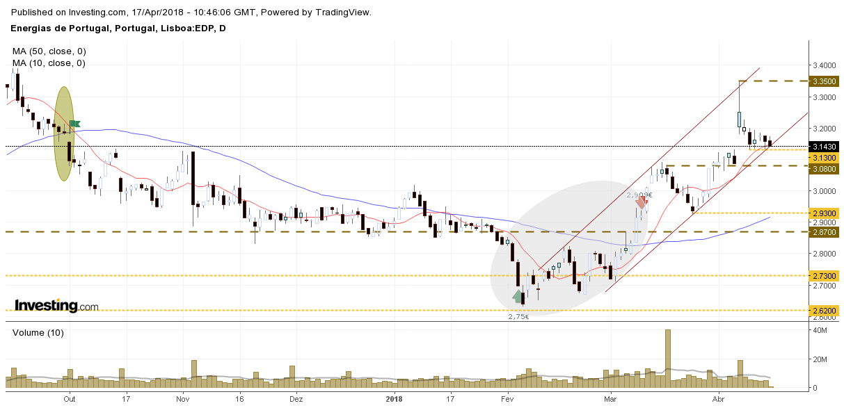 O gap de 29 de Setembro foi fechado no dia 11 de Abril, no entanto, ficou um espaço sem negociação entre os 3,13 e os 3,085€.