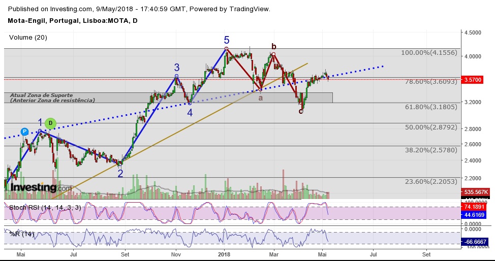 Curioso que tanto ontem como hoje aliviou das fortes quedas pelas quais passou. Ontem chegou a cair quase 3% e fecha a cair 1,76%. Hoje chegou a cair quase 2% e ameaça fechar com ligeira queda. Esta Mota Engil é de alguma complexidade técnica e acho uma cotada interessante, só nao sei 2 coisas. Se está em Bull ou Bear bem como se está mais perto dos 4€ ou dos 3€. Ulisses qual achas ser o caminho?