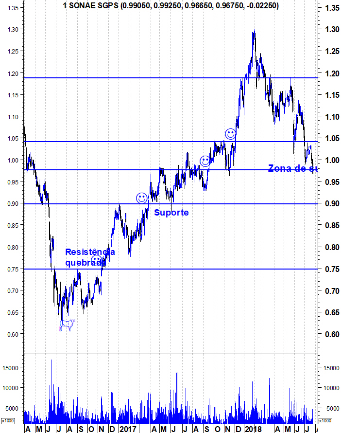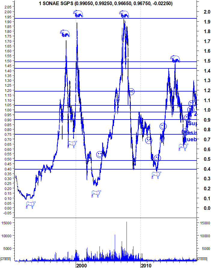 Ulisses Pereira Escreveu:A Sonae fechou ligeiramente abaixo do seu suporte. Eu diria que fechou na zona de suporte. O volume foi forte, o que não é positivo para os touros. Mas o facto de estar na zona de suporte e estar "sobrevendida" faz com que acredite que é difícil quebrarem consistentemente o suporte nesta tentativa. Acharei mais provável uma quebra de suporte quando a acção o atacar sem estar em "sobrevenda".