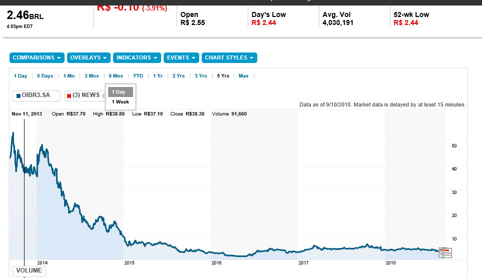 EU não acredito em grandes valorizações futuras da cotada OIBR 3 e Pharol ( Tirando especulação diária da Pharol claro) , devido aos problemas estruturais que vai manter mesmo depois do aumento de capital e face aos fortíssimos concorrentes que têm vindo a conquistar quota de mercado , e a evolução do gráfico nos últimos anos mostra o que se tem passado com a cotação , fruto da evolução da empresa .