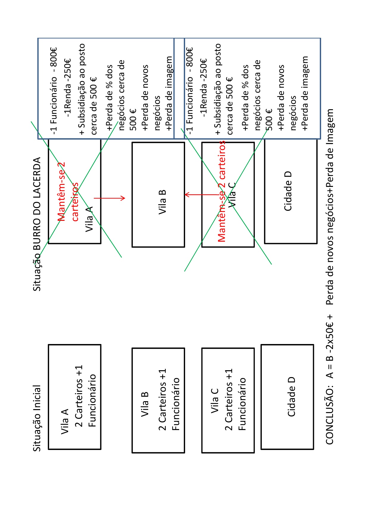 Os carteiros da estação A e C ficam agregados à estação B, o que significa continuarão com as mesmas zona, mas sempre que houver qualquer questão, têm que se deslocar a B, ao invés de tratarem os problemas na estação onde efectivamente estão.