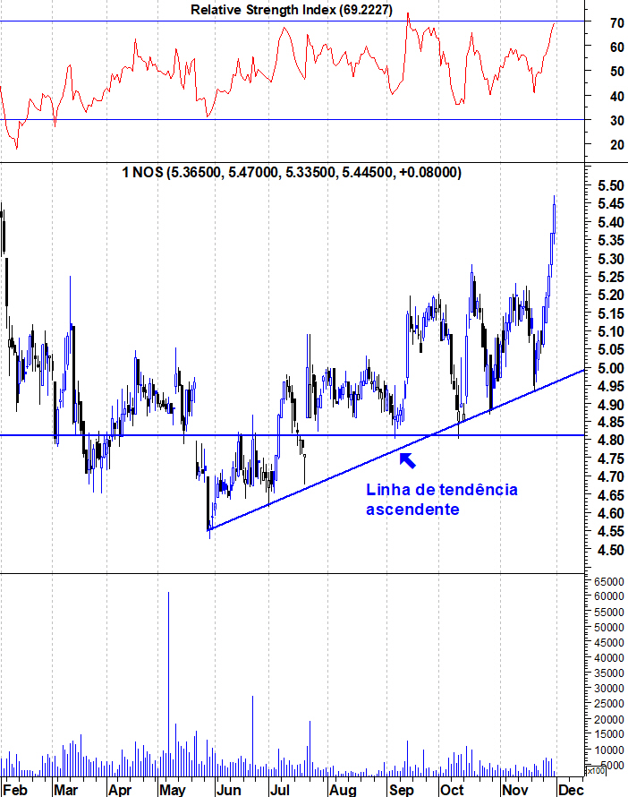 A Nos continua a dar sinais de querer inverter a tendência descendente. Já lá vão 7 meses de subidas e, enquanto a acção mantiver intacta a LT ascendente que tem suportado o título nestes últimos 7 meses, os touros têm motivos para sorrir.