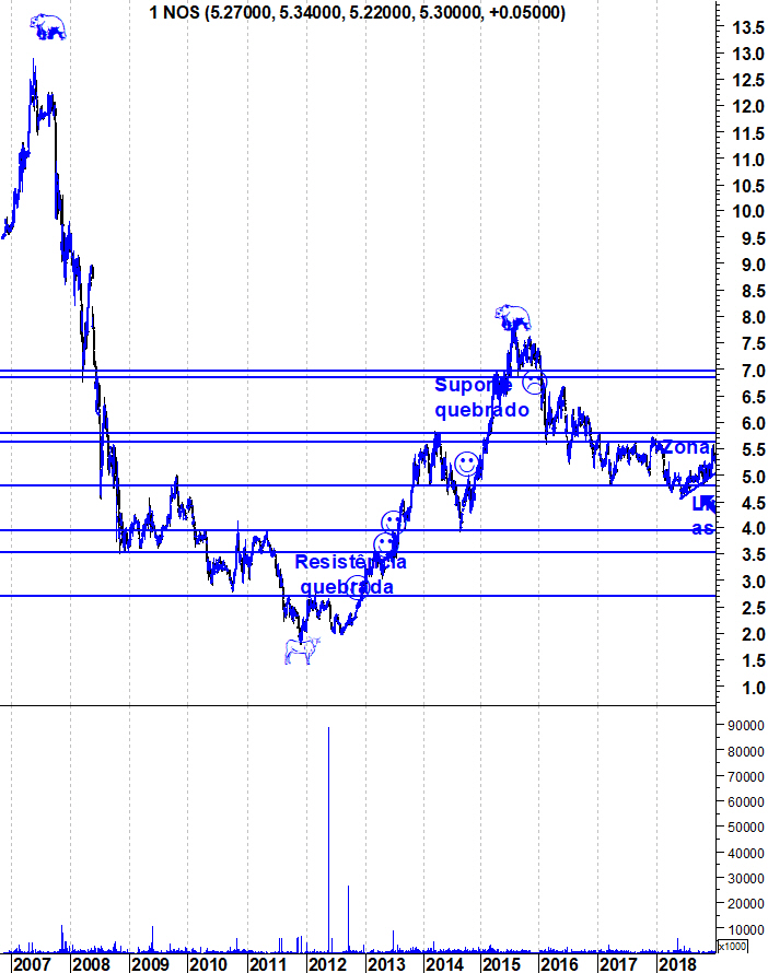 Deixo os gráficos actualizados da Nos, onde os touros têm controlado a acção nos últimos 6 meses, contrariando a fraqueza geral do mercado.