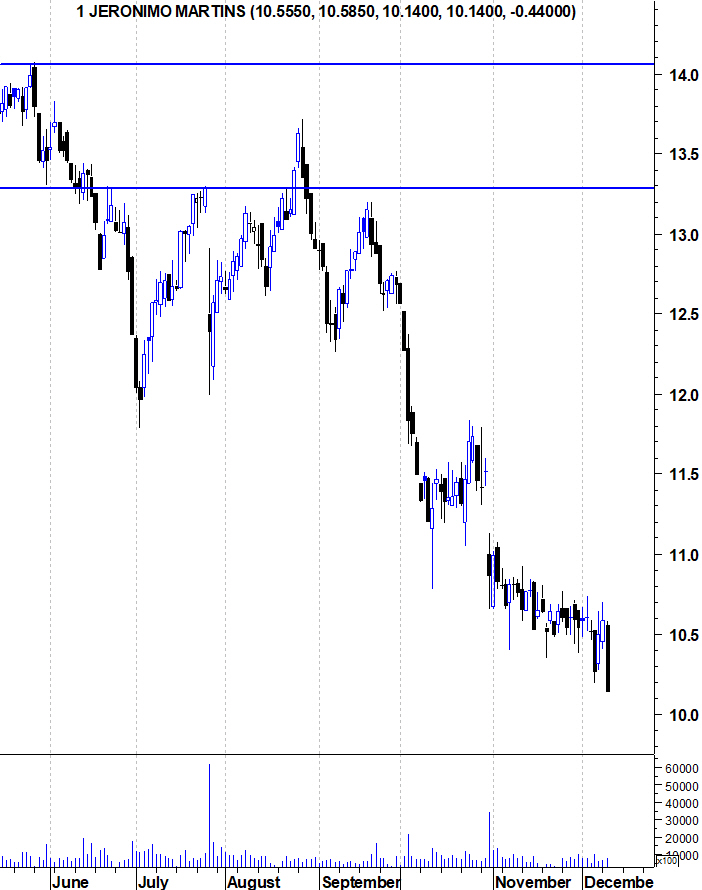 Não há novidades na Jerónimo Martins. A acção continua o seu "Bear Market" sem dar qualquer sinal de força. Depois da quebra do suporte nos 15,4 euros, os sinais de fraqueza eram claros e ainda não houve qualquer sinal que indicie inversão de tendência.