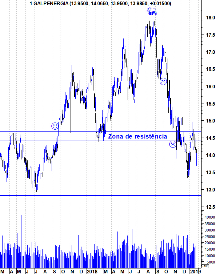 Se um título cai até 14,09 e sobe até 14,79 num dia (para não dizer em meia hora e para não falar em prazos mais longos) é difícil falar em resistência, suportes, tendência etc.