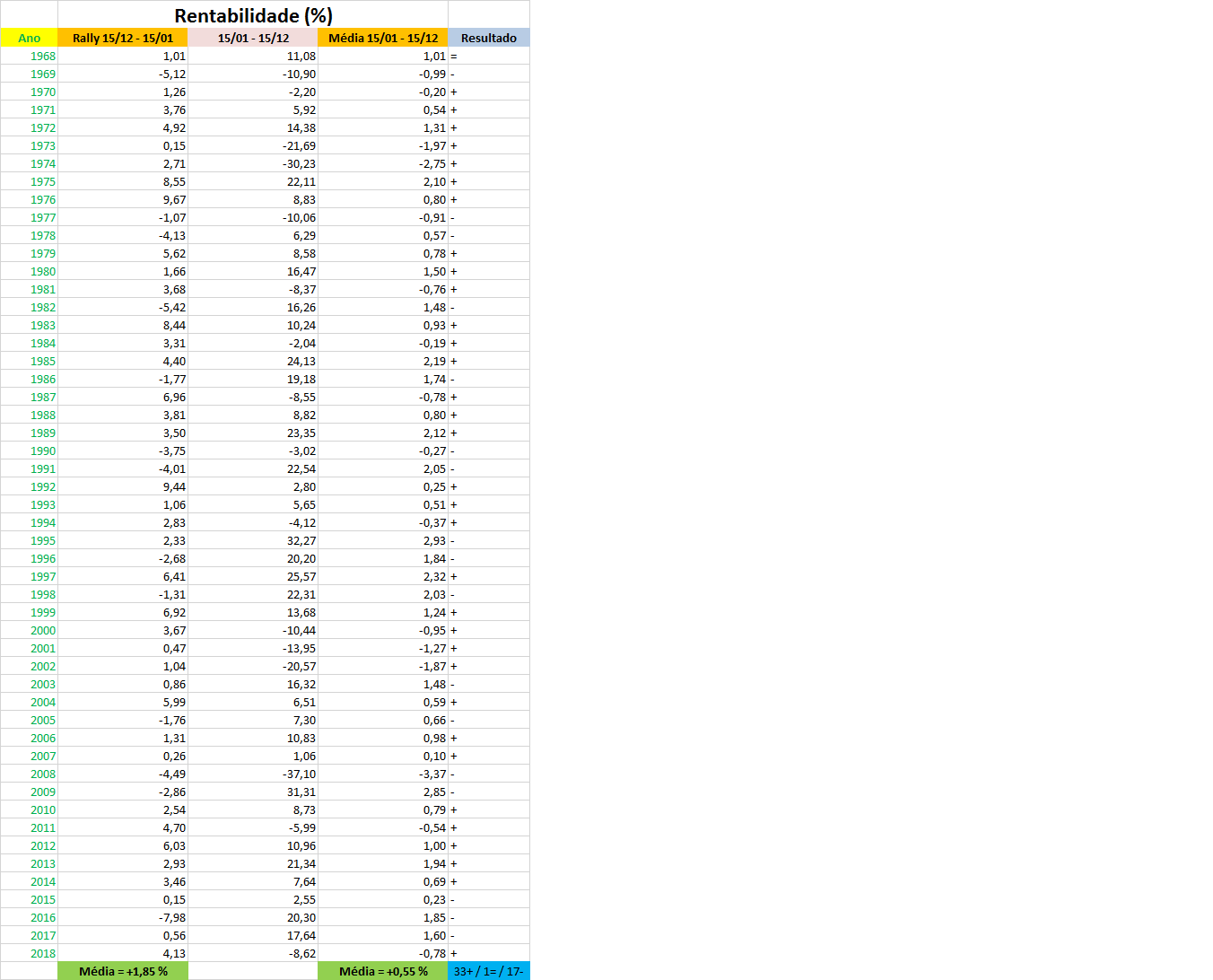 As conclusoes para mim sao cristalinas: por 2 vezes em cada 3 anos sucede em média que o mês do rally natalício supera a rentabilidade média do mês representativo dos 11 meses seguintes e, mais importante ainda na minha humilde perspetiva, a média da rentabilidade do mês do rally supera em 3,36 vezes o retorno médio mensal dos restantes 11 meses de mercado até ao início da contagem do ano seguinte pelo score de 1,85% contra 0,55%!