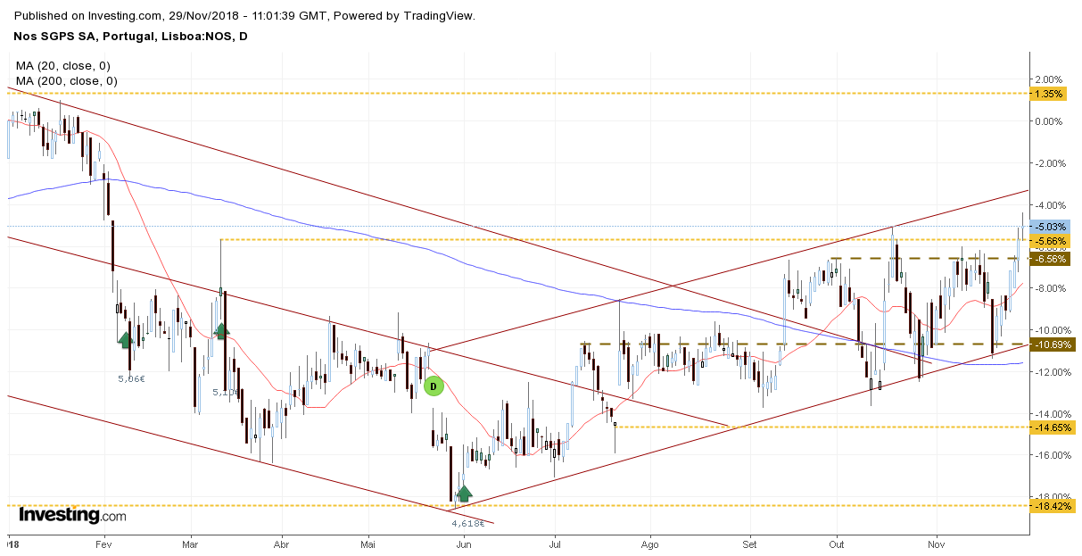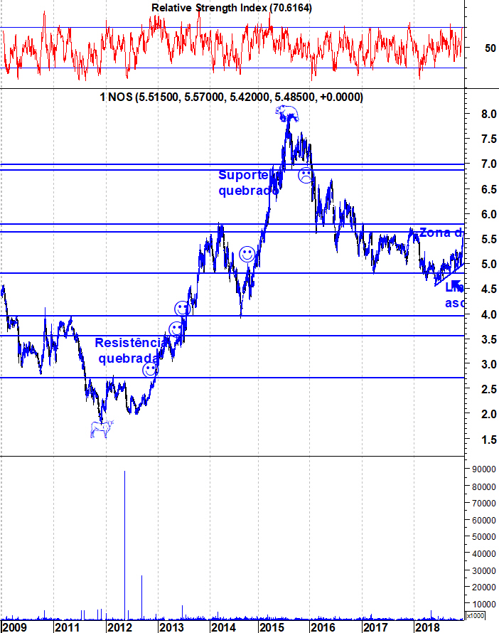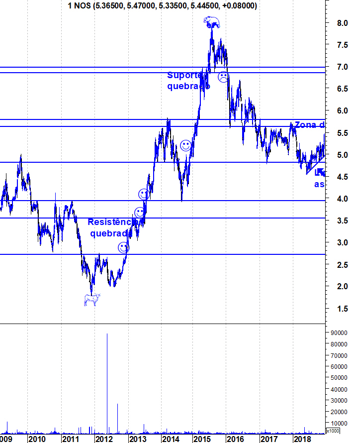 É, por tudo isto, hora de vestir o meu fato de touro na Nos. Os sinais de força num mercado abandonado tornam-se ainda mais relevantes e é um aspecto ao qual dou sempre bastante importância. Em termos de análise técnica, as recentes subidas da acção têm desenhado uma linha de tendência ascendente, que tem marcado o ritmo dos últimos meses. Enquanto a acção se mantiver acima dessa linha, os touros estão no comando da situação e eu envergo, orgulhosamente, o seu fato.
