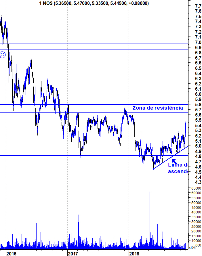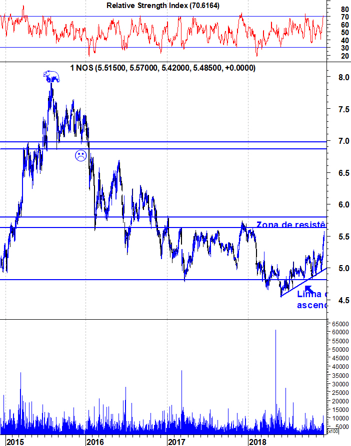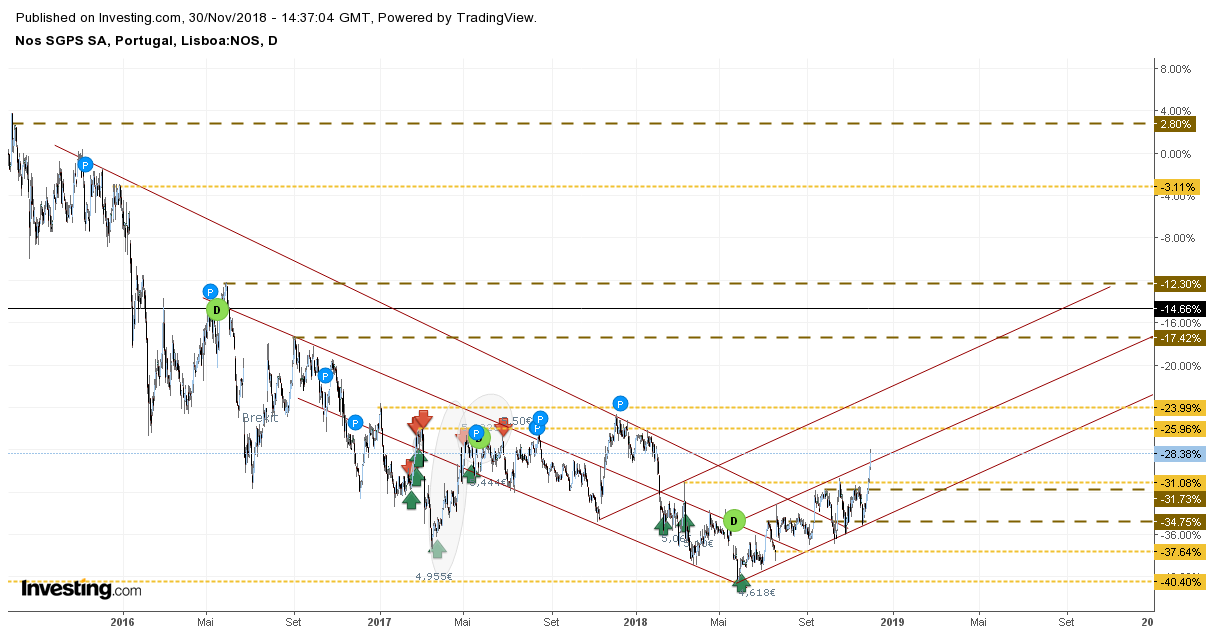 A Nos continua a dar sinais de querer inverter a tendência descendente. Já lá vão 7 meses de subidas e, enquanto a acção mantiver intacta a LT ascendente que tem suportado o título nestes últimos 7 meses, os touros têm motivos para sorrir.