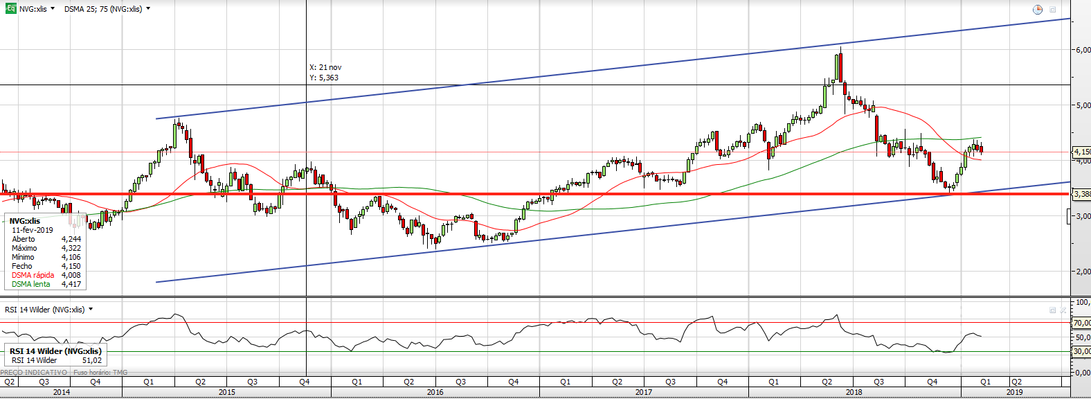 Técnicamente acredito que está num bom momento tendo que ultrapassar a base de consolidação que fez junto dos 4,32.