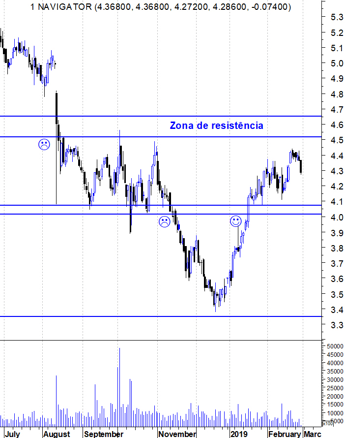 Depois de sucessivos sinais de fraqueza no segundo semestre do ano passado, a Navigator acordou no arranque deste ano, dando o primeiro sinal de força na ruptura da zona de resistência entre os 4 e os 4,07 euros. O grande desafio da acção é a zona de resistência entre os 4,52 e os 4,65 euros que travou todas as tentativas de ressalto da acção no segundo semestre do ano passado.