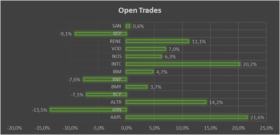 - Reforço em NOS: Duplicámos a posição para 8.35 % (3.34 % incluindo Cash na carteira). Demos numa de AT (