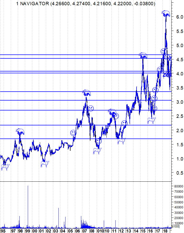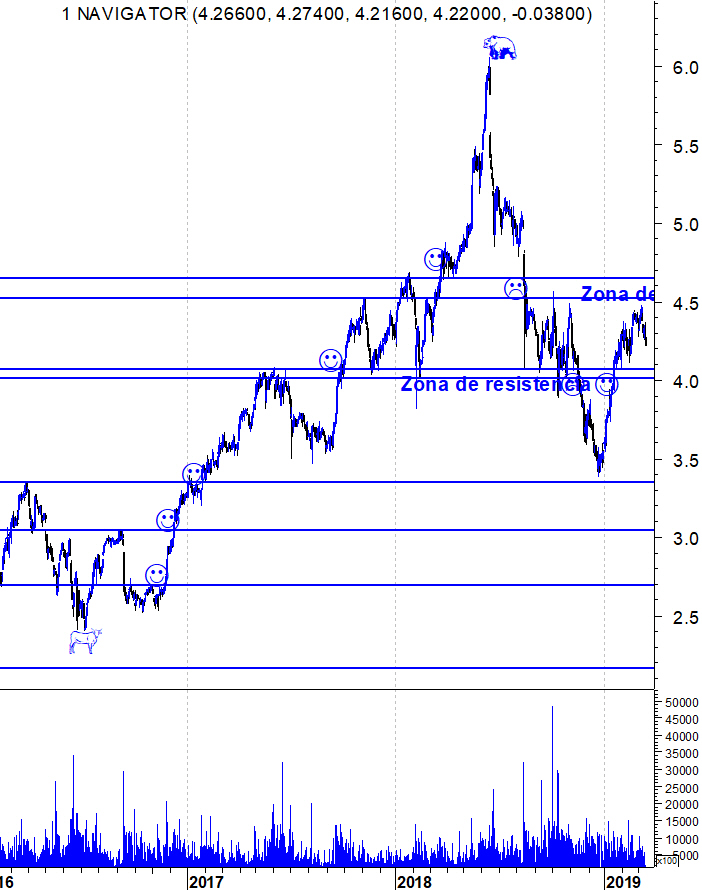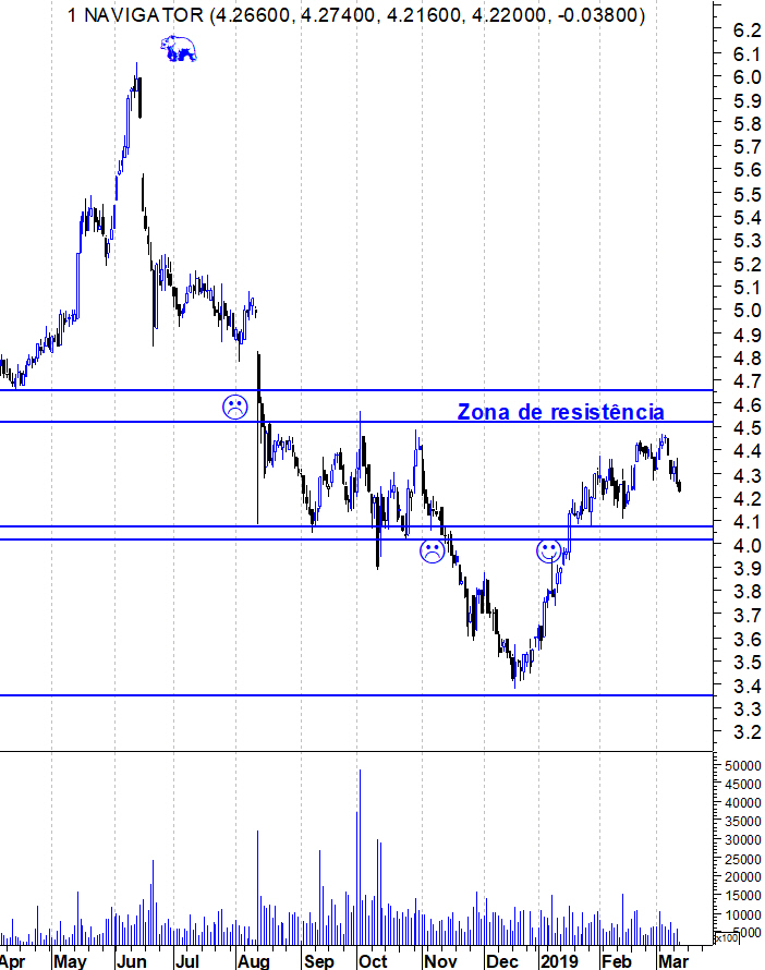 O primeiro sinal de força ocorreu este ano com a Navigator a quebrar a primeira zona de resistência entre os 4 e os 4,08, indiciando que algo tinha mudado e que a tendência descendente poderia ter chegado ao seu final. Contudo, a acção parou esta subida numa crucial zona de resistência entre os 4,52 e os 4,65 euros. Esta resistência tem servido de tecto para várias tentativas de ressalto da acção. Quebrar consistentemente esta resistência seria como libertar a acção, havendo depois muito espaço para subir.