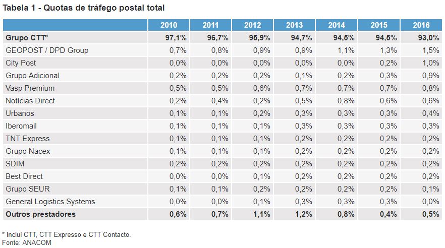 O que é o trafego postal total ? Inclui as cartas ? É que se assim for os CTT assim são monopolistas e não é grande comparação com concorrentes , alem que com comunicações eletronicas esse é para continuar a cair todos os anos . As cartas vão diminuir a receita todos os anos .