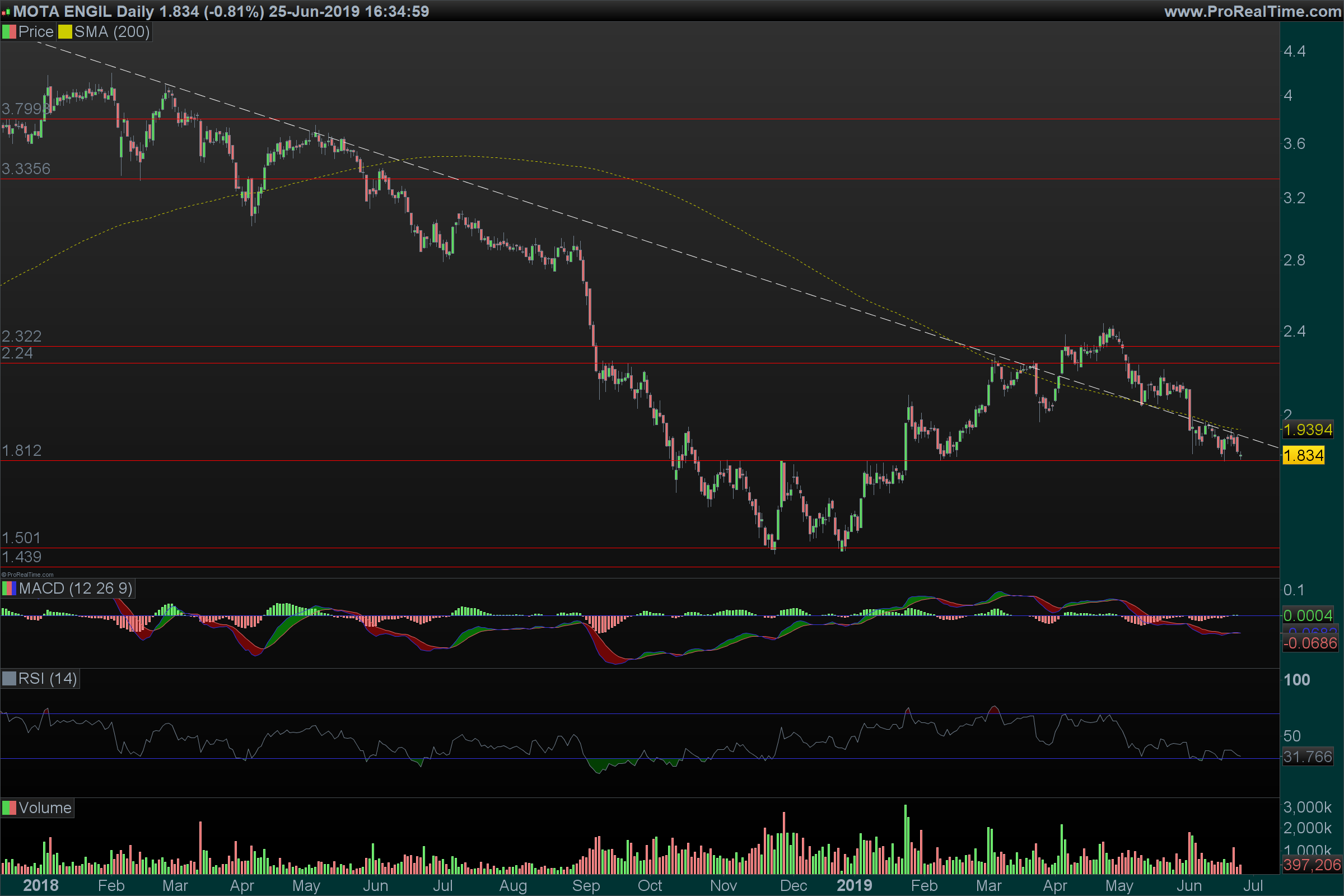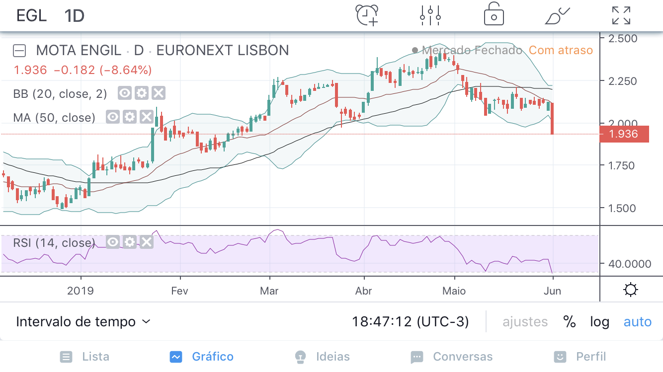 Boa tarde tal como referi aqui á uns dias atrás a tendência da mota engil era vir tocar o suporte dos 1.80 anterior resistência , está agora num momento de decisão pois esta zona é decisiva para a manutenção do bull neste titulo, tal como o psi20 ,que também se encontra em zona de decisão ,o mercado está extremamente volátil e esta semana podemos ter um alivio ou um afundar tudo depende de como o mercado interpretar as decisões da FED sobre o futuro da politica monetária nos EUA , muitos outros títulos se encontram basicamente nesta situação, quarta feira depois das 19h00 podemos tomar um rumo até lá acredito que possa negociar nesta zona dos 1.80