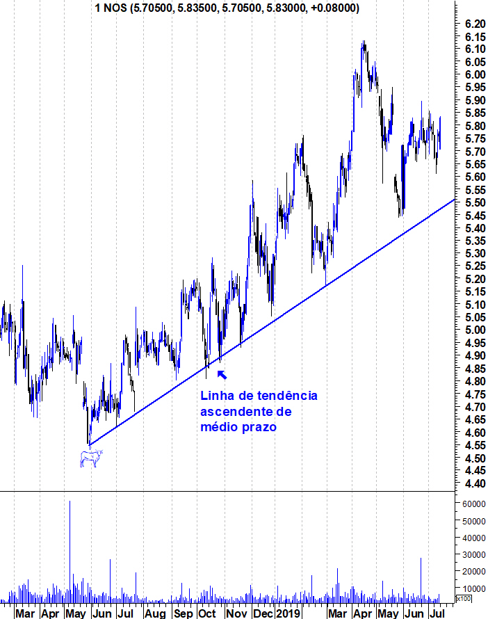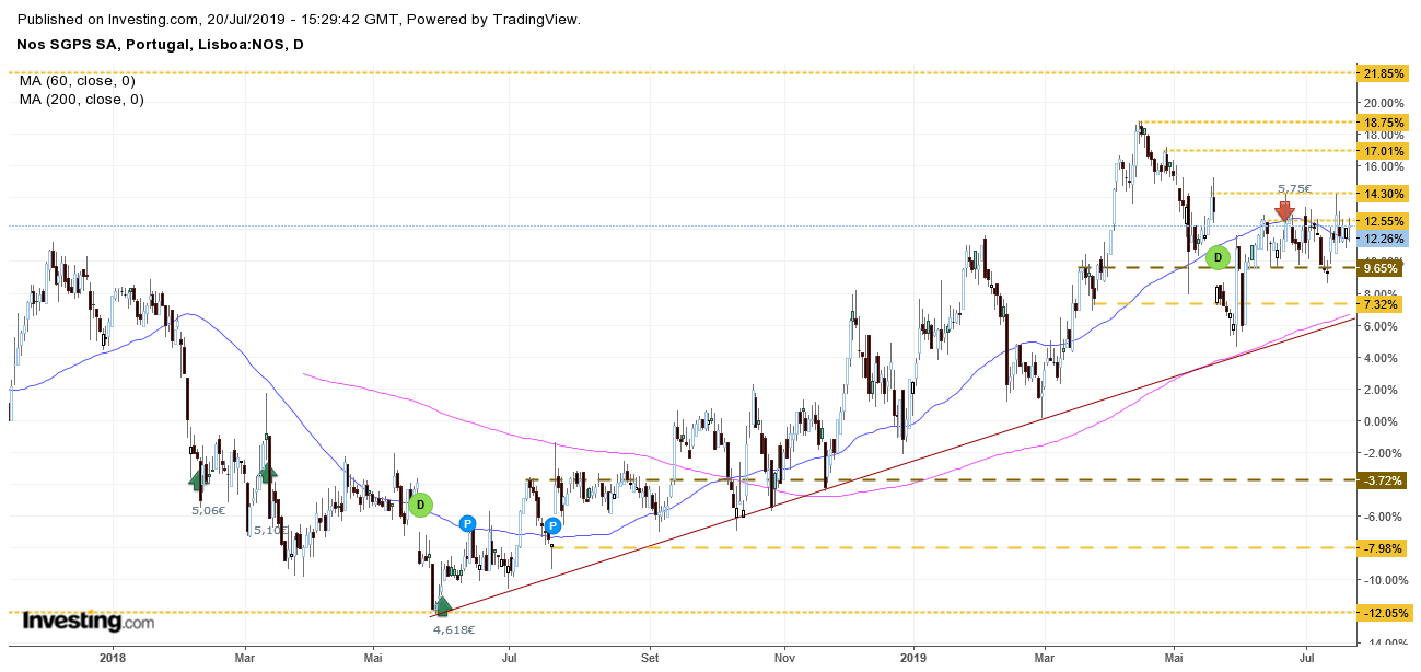 A Nos continua o seu "Bull Market" sereno, discreto. A sua grande referência continua a ser aquela LT ascendente que se pode ver no gráfico. Enquanto se mantiver intacta, mantenho o meu optimismo.