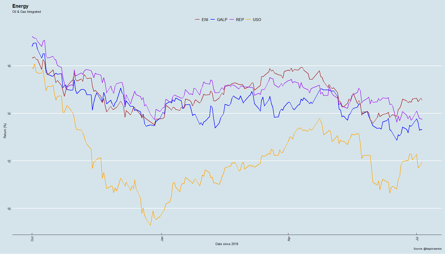 A Galp viveu um “Bull Market” plurianual que terminou em Agosto do ano passado. A quebra da resistência dos 16,4 euros, em Outubro, foi o sinal para despir o meu fato de touro. Muitos justificaram as quedas dos meses seguintes com a descida forte do preço do crude. No entanto, durante os primeiros 5 meses deste ano, o crude teve uma subida muito expressiva sem que isso tenha originado subidas da Galp.
