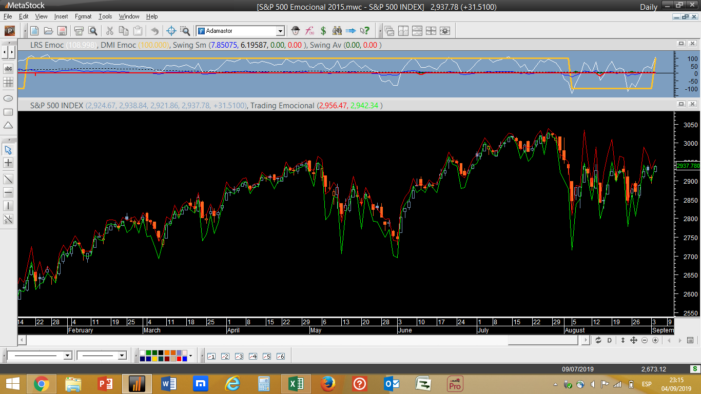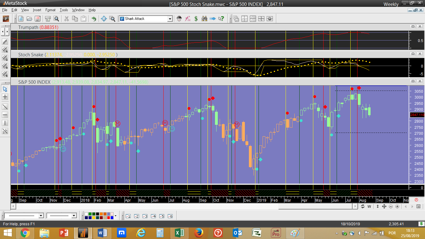 A confirmar que o índice norte-americano poderá estabilizar num trading range horizontal a rondar os valores atuais, poder-se-á antecipar que uma boa estratégia no setor acionista a partir da data presente poderá ser a de apostar para as próximas semanas em indicadores oscilatórios de curto/médio prazo do tipo estocástico, comprando provavelmente na zona dos 2700 a 2800 e vendendo na área dos 2950 a 3050.
