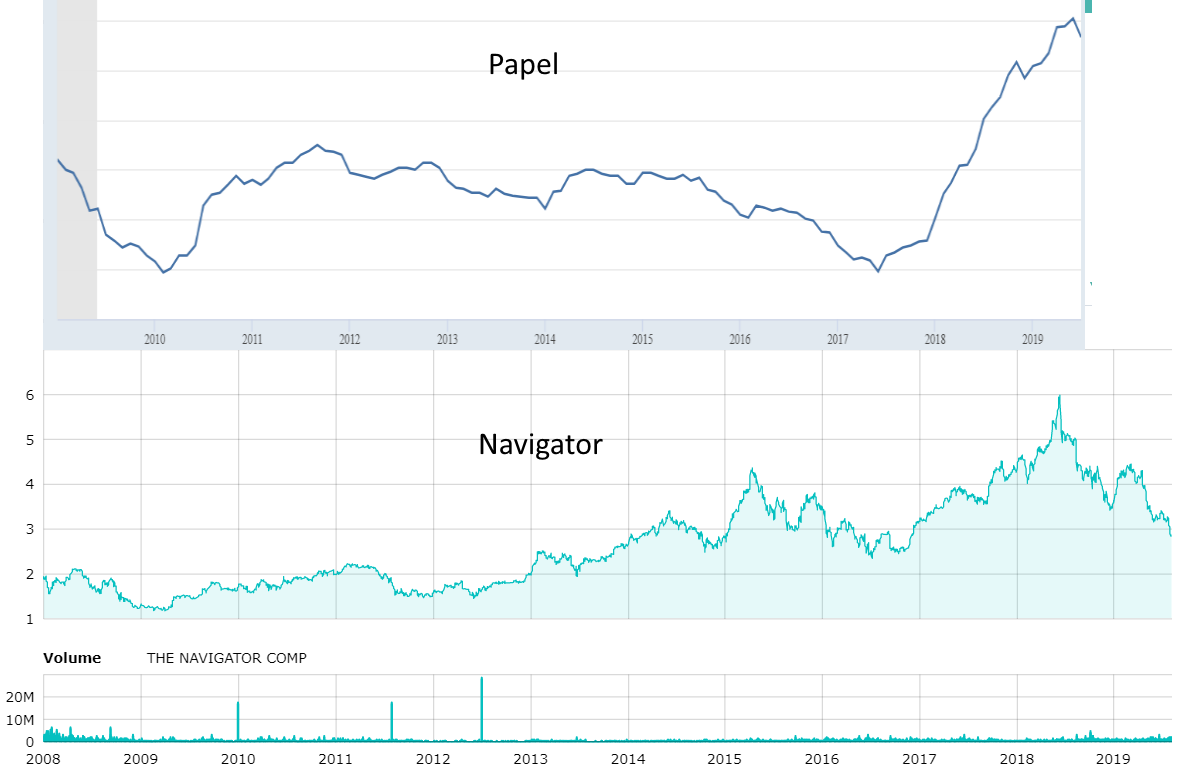 Correlação considerando um período de 3 anos (Ago 2016 a Jul 2019): -0,36, a correlação deu negativa, ou seja, em três anos a variação do preço do papel teve uma correlação oposta (-36%) relativamente à evolução do preço da ação da Navigator