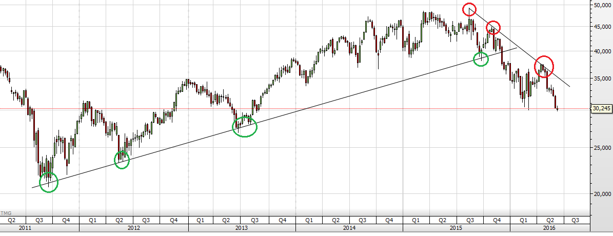 Tem uma resistência na zona dos 37, correspondente aos máximos relativos de 2011.